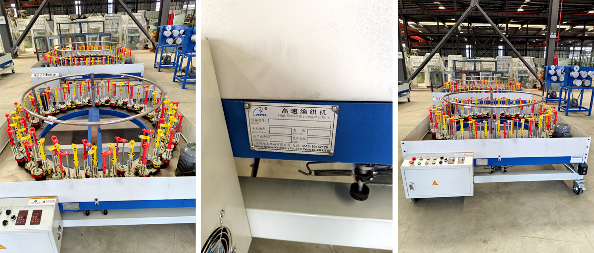 編織成品:防火套管 材料名稱:玻璃纖維 ?! Ъ痈甙踩雷o(hù)扁鐵,帶中心支撐桿?! 【幙棛C(jī)地面到編織機(jī)上盤面高度450mm,帶萬向輪?! 『瑩尉€盤,...